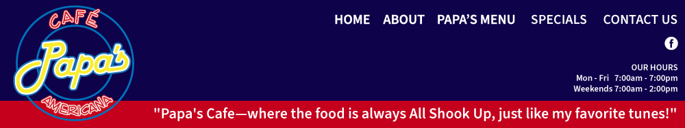 Papa's Cafe is your go-to spot for delicious, home-cooked meals in a warm and friendly atmosphere. We specialize in classic American cuisine, bringing you the comfort food you love with the quality you deserve. Whether you're craving a hearty breakfast, a satisfying lunch, or a cozy dinner, we've got you covered.